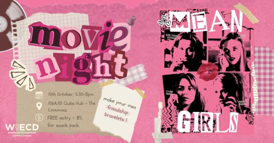 🚌✨ Get in loser, we're going to WiECD's Movie night to watch the most fetch movie ever - Mean Girls!  💖 On this Friday night, bring your friends and wear pink! This is the perfect change to meet the WiECD committee and other engineering students whilst creating cute friendship bracelets to remember the night!  🧁 Feeling peckish during the movie? You can purchase a snack pack voucher for $5 for an endless supply of snacks and drinks, the limit does not exist!    DETAILS:  📍 106A.101 - The Commons @ Clubs Hub, Curtin University  ⏰ Event runs 5:30-8:00pm (movie starts at 6:00pm) 🌟 Kahoot Quiz at the end - test your knowledge and show off your "fifth sense"  🎟️ FREE entry to the event (you can purchase a $5 snack pack voucher for access to snacks upon entry)    💌 We can't wait to see you there ~ fetch is finally happening! 💌   * A registered ticket is COMPULSORY to attend the event. * You MUST be an enrolled Curtin University student to attend