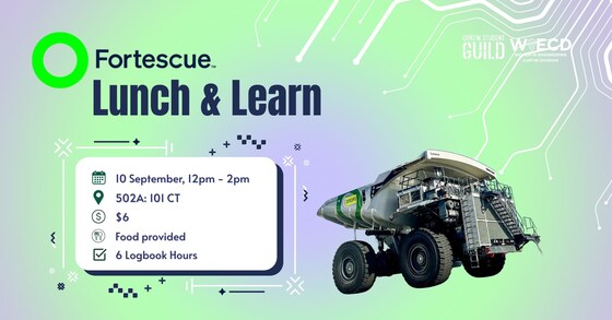 Curious about what your future as an engineer may look like? Come join us for Fortescue Metals Group's Lunch and Learn where you'll get an inside scope into current projects, vacation/graduate programs, and the company's future vision.  This is the perfect opportunity to learn about future opportunities with FMG and grow your network with industry professionals. Food will be included in the purchased ticket just in case you're feeling a bit peckish halfway through!  🕓 6 Weighted Logbook Hours  🍕 Food will be provided! 🗓️ 12-2pm Wednesday 10th September  📍502A.101 CT * Ticket prices include booking fee  * Refunds cannot be processed within 4 days prior to the event